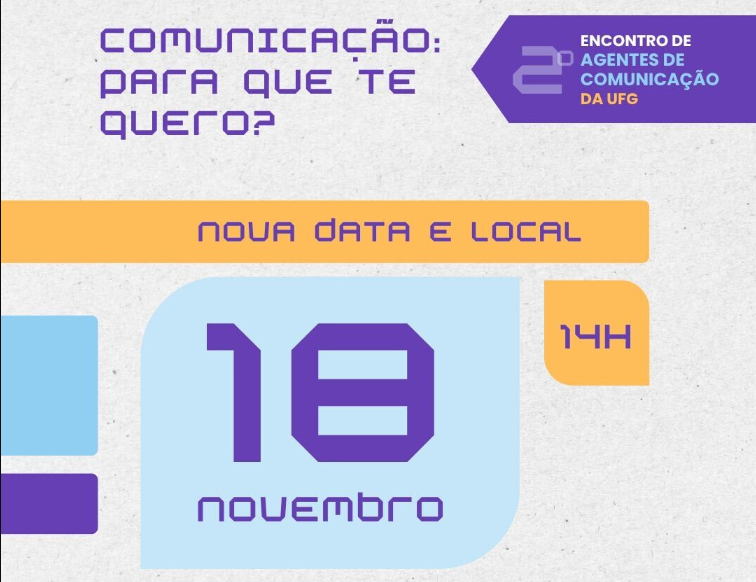 A Secretaria de Comunicação da UFG realiza no dia 18 de novembro o 2º Encontro de Agentes de Comunicação da UFG. O objetivo do evento é promover a aproximação e o diálogo entre a Secom e as Unidades Acadêmicas e Órgãos administrativos da UFG, estimulando a troca de experiências e apontando caminhos para que a Comunicação na UFG seja cada vez mais eficiente.